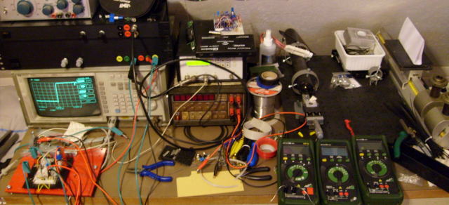 first tryAs you can see below the setup I then had in my room was already quite nice. A 400MHz HP 54502A, a Keithley 6.5 digit DMM and a BNC 500 pulse generator. At that time I preferred the metrahit multimeters, as you can see I had 3. They're high quality 4.5 digit DMM's, probably comparable to a good FLuke, but because those are popular and thus high in price I went for these.