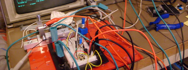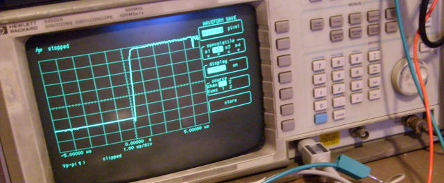 My lab when it was still smallThe actual setup is on the red DIY optical breadboard. The pulse generator driver a mosfet on a breadboard which switches the power to what's left of the laser pointer. It's a bullet style pointer of which I removed the casing and batteries. That leaves the switch (which I bypassed), the resistor and laserdiode. Varying the supply votlage will determine the power output of the laser diode. On the same breadboard is the photodiode. It has a 12v bias and the output is measured by the oscilloscope probe. Unfortunately the parasitic capacitances of this setup are relatively large, so it's no surprise the bandwidth of this system is lower than the individual components. The scope (HP 54502A) is 400MHz (100MHz single shot), the probe (Agilent N2863A) 300MHz and the photodiode (Osram SFH213) has a risetime of 5ns