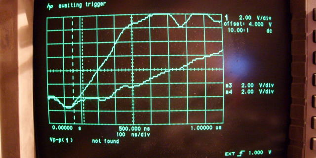 First measurement resultThe setup now moved to the ground because I used the hallway and the room opposite to mine to create a distance for the light to travel. I got a 7.5 meter separation between the laserdiode and photodiode setup and the reflector. The roundtrip is thus 15 meters long, or 50ns.